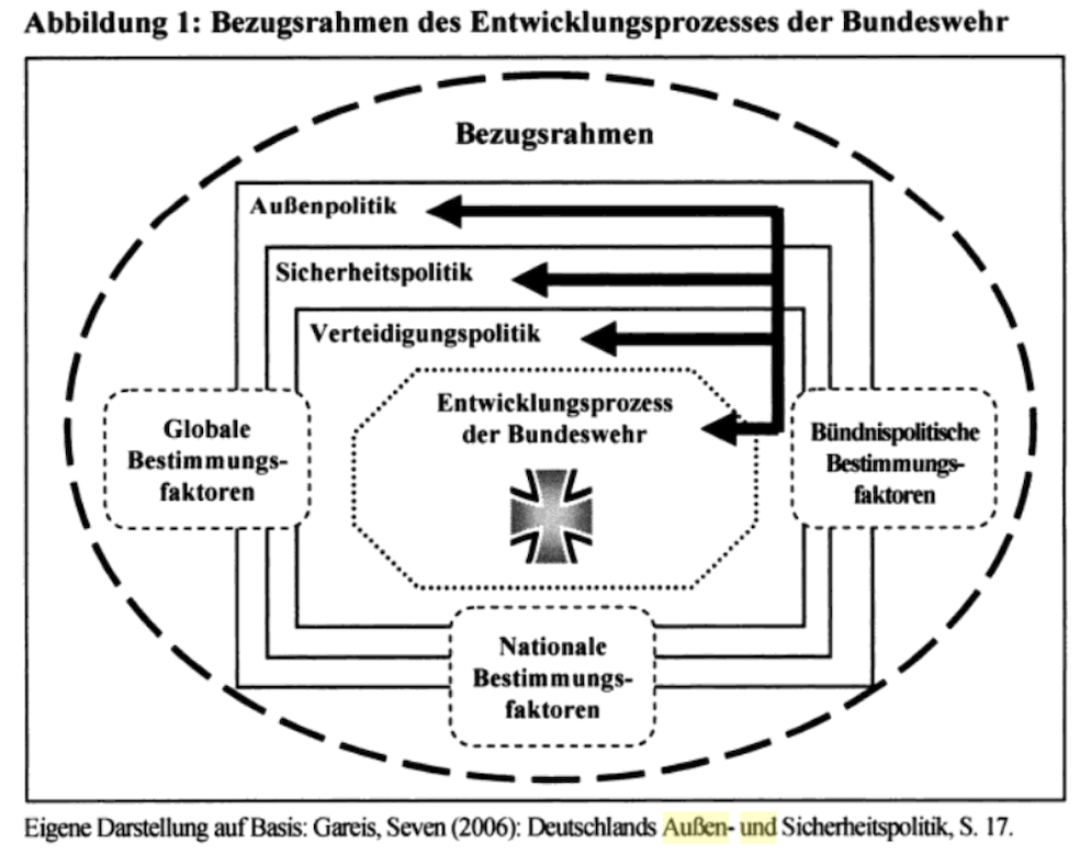 Analytic Framework. The most useful framework of the German Defence Force policy process is developed by Henrick Heindekamp (2014) in his Der Entwicklungsprozess der Bundeswehr zu Beginn des 21. Jahrhunderts: Wandel im Spannungsfeld globaler, nationaler und bündnispolitischer Bestimmungsfaktoren. As the image below shows, the author views this process as nestled within the Foreign, Security, and Defence policies of the German Government, and as shaped by three key sets of factors: global, national, and coalition politics decision-making factors. This framework is closely related to the one being developed by our study.